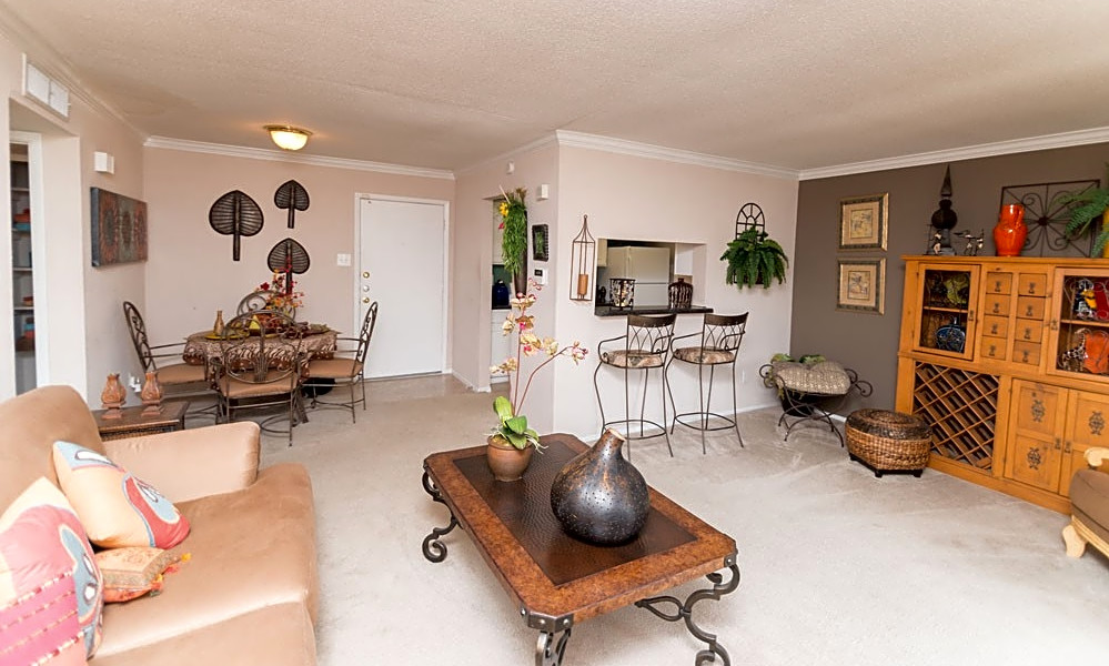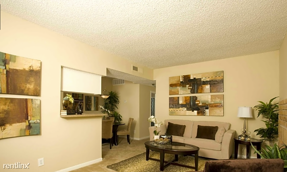 Listed at $802/month, this 758-square-foot one-bedroom, one-bathroom apartment is located at 9801 Meadowglen Lane.
