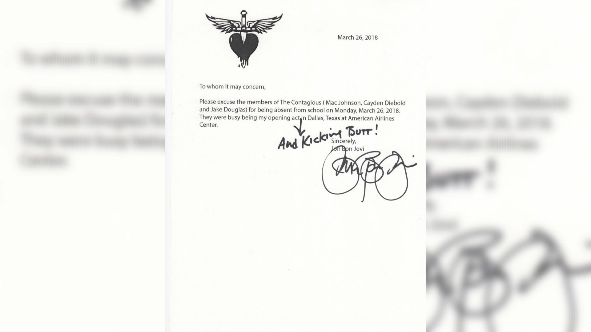 The now viral note read in part, "Please excuse the members of The Contagious ... They were busy being my opening act in Dallas."