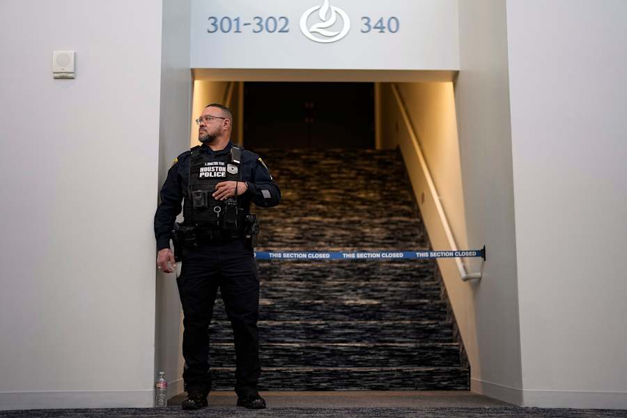 Officers from various law enforcement agencies, including Houston Police, walked the hallways during and between services Sunday.