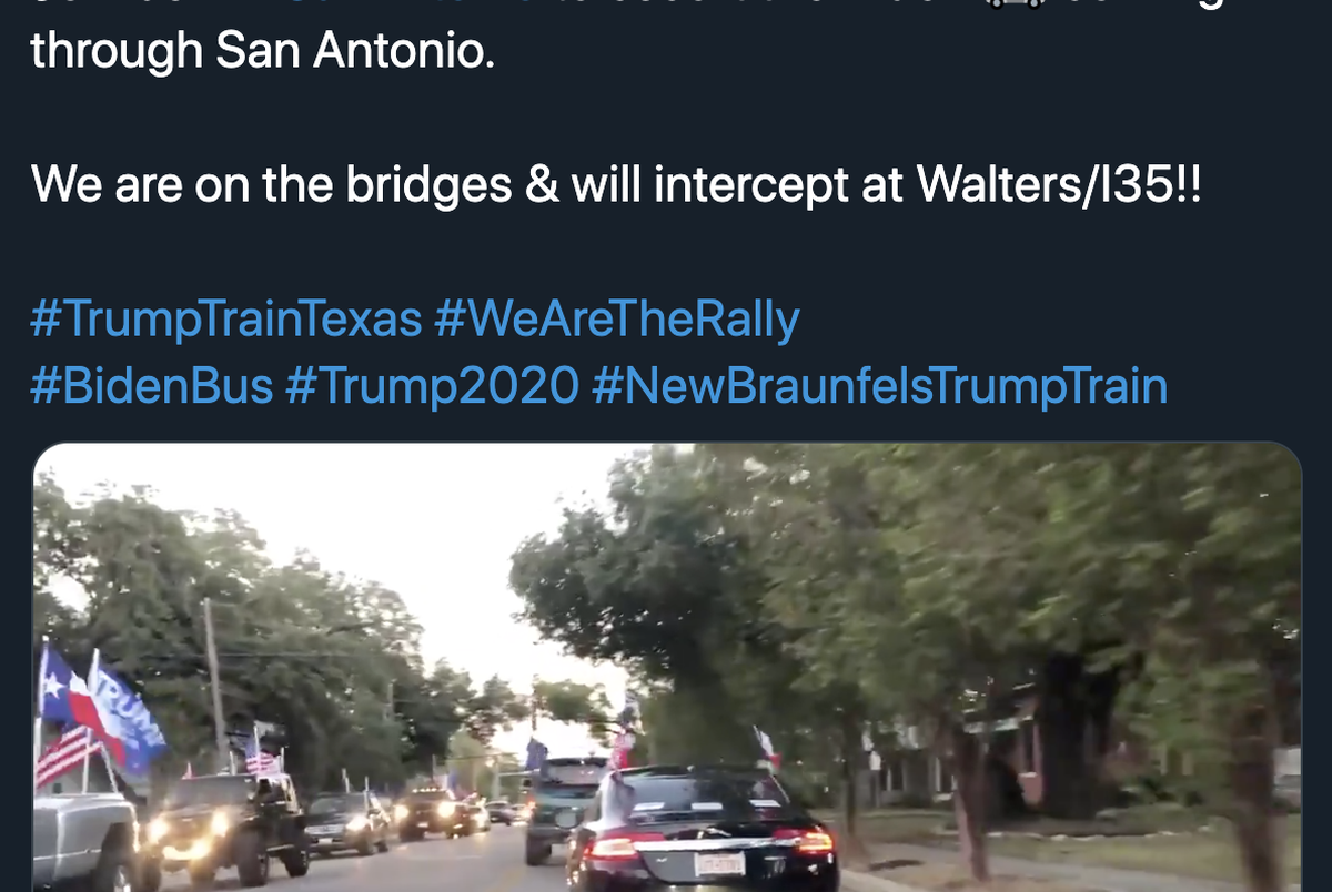 Cervini told the Tribune that when he arrived in San Marcos, he started to hear from people on the bus that the Trump supporters had started following them closely, honking their horns and shouting. According to the Biden campaign, multiple trucks pulled in front of the bus and appeared to try to slow it down. The campaign canceled the event in San Marcos and proceeded directly to Austin where another event was scheduled at the AFL-CIO in downtown Austin.