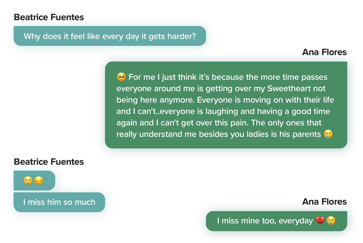 Eventually, each of the women sought out other widows and found Facebook support pages full of mourners. Delia and Betty met online in one of the groups, and when Ana joined and posted her story, Delia sent her a message.