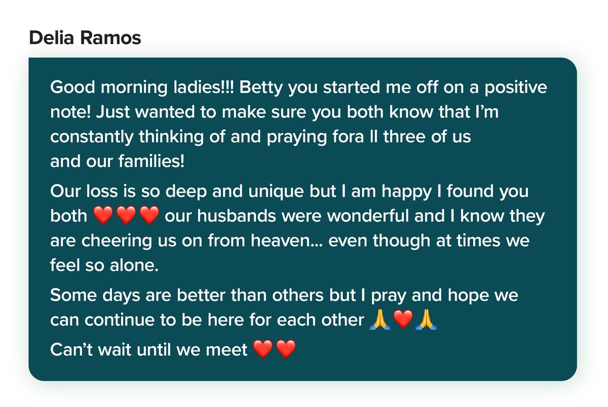 “Our loss is so deep and unique but I am happy I found you both <3 <3 <3 our husbands were wonderful and I know they are cheering us on from heaven… even though at times we feel so alone.”