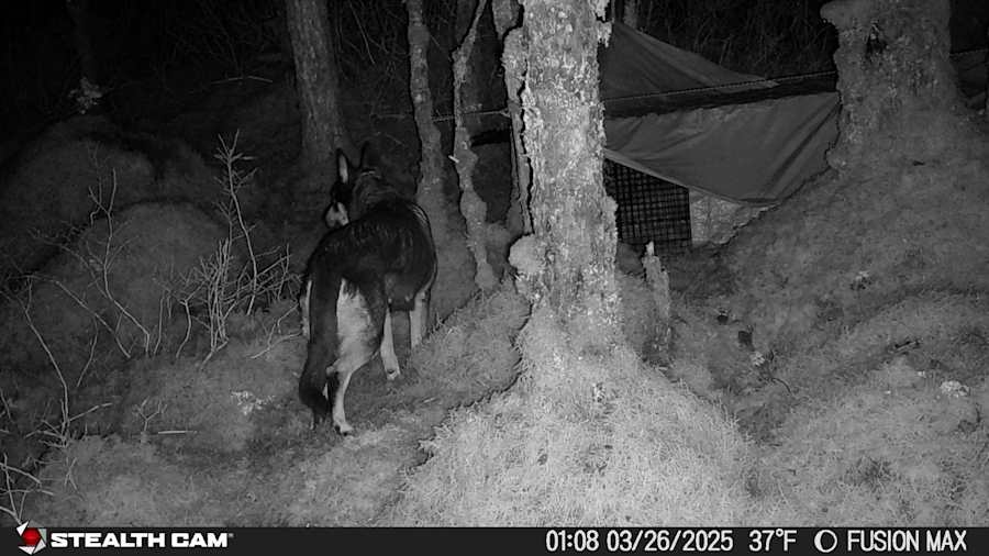 Young-Bayer and his wife, Skylar, have been searching in their free time, often at night, for the skittish canine, painstakingly trying to build trust with her. Jackie has been known to burrow into the soft moss on the forest floor for cover and to avoid looking directly into the Young-Bayers’ headlamps, making it hard to detect her eyes in the dark.