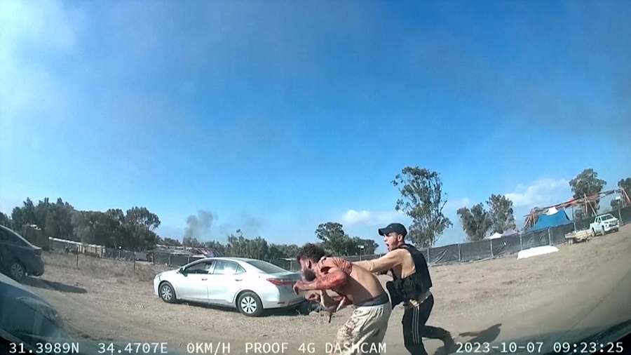 Argamani, her face contorted in panic, shouts “No, no!” in Hebrew while being forced onto a motorbike, sandwiched between two gunmen. She reaches out for Or, whose hands are bound behind his back as a group of militants march him forward.