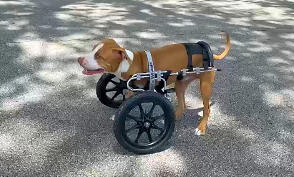 It’s been a long journey to get here. Goose had to have his front leg amputated and has had ongoing rehabilitation to increase strength. Then he was fitted with a wheel cart that gives him the ability to go longer distances. Goose will always be a special needs pup and he will need someone who can continue to provide him with the resources he needs to maintain his mobility — patience and time. Having another dog in the home would be preferred because he missed out on developing critical socialization skills.