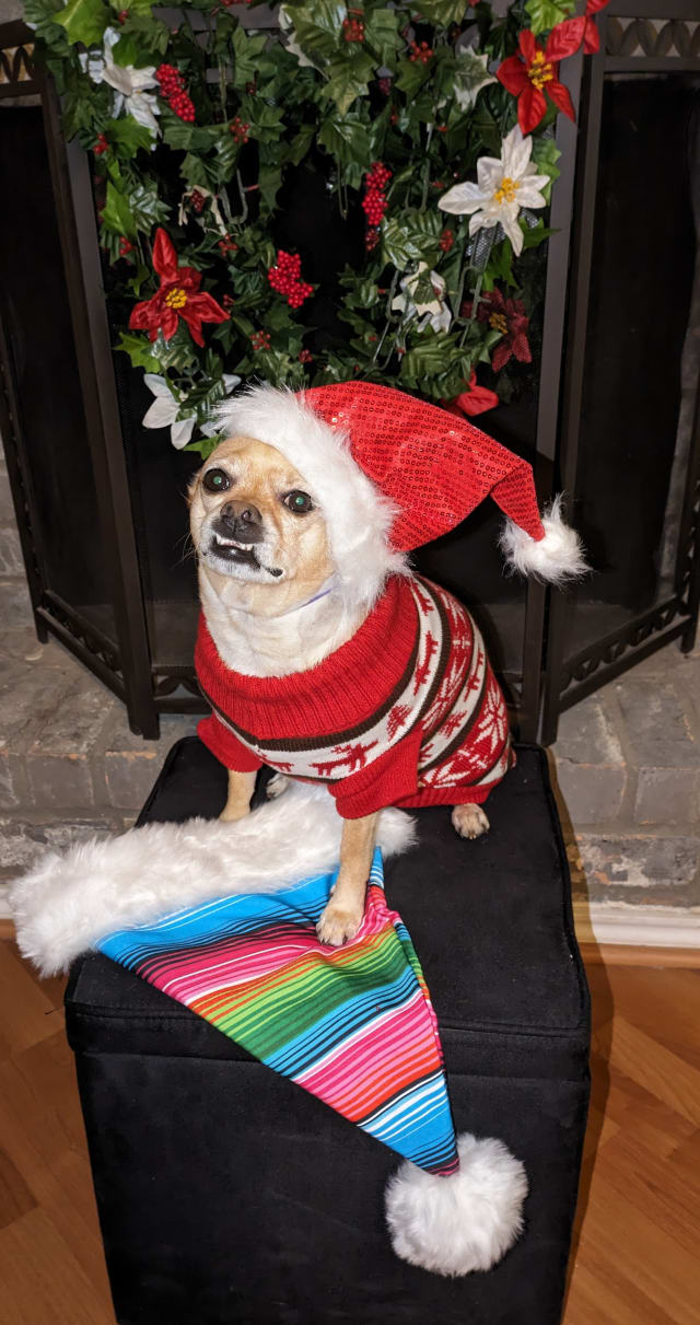 Boo is smiling for his Treats for Christmas.