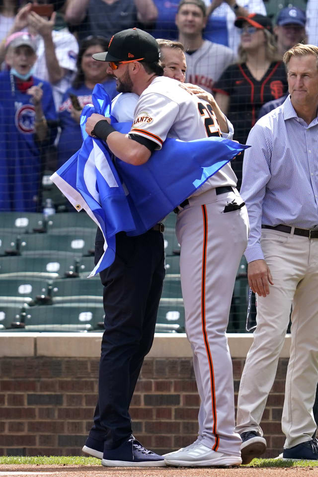 After watching the video tribute while standing in front of the Giants dugout, Bryant strolled to home plate for handshakes and hugs with Cubs owner Tom Ricketts and other team officials.
